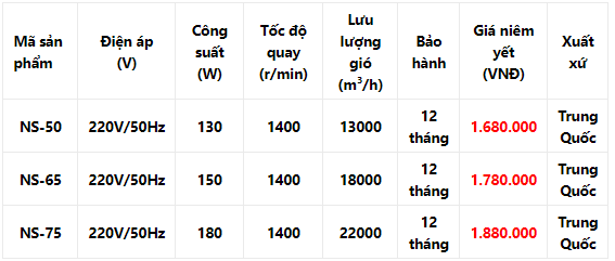 NS-50 , NS-65 và NS-75. Quạt có kết cấu cân đối, vững chãi và thẩm mỹ cao.